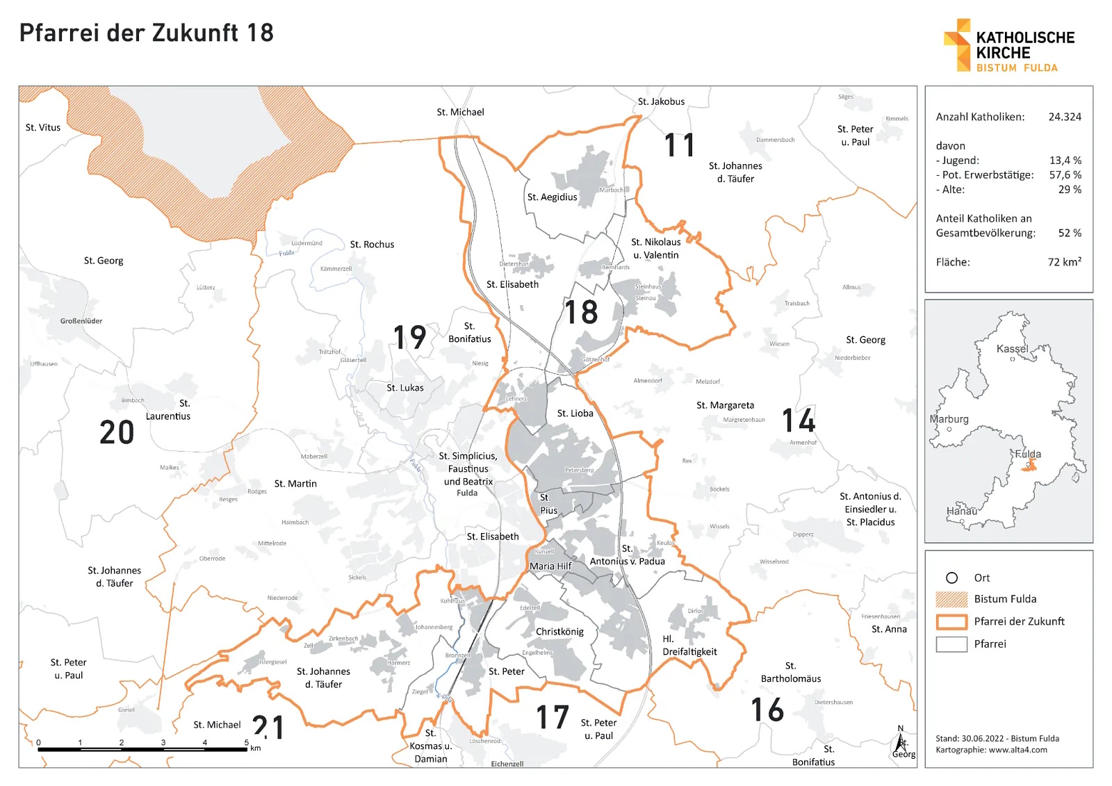 - Katholikenzahl 2035 (-25%): 15.959 (Prognose unter Berücksichtigung u.a. demografische Entwicklung, Taufzahlen, Kirchenaustritte)